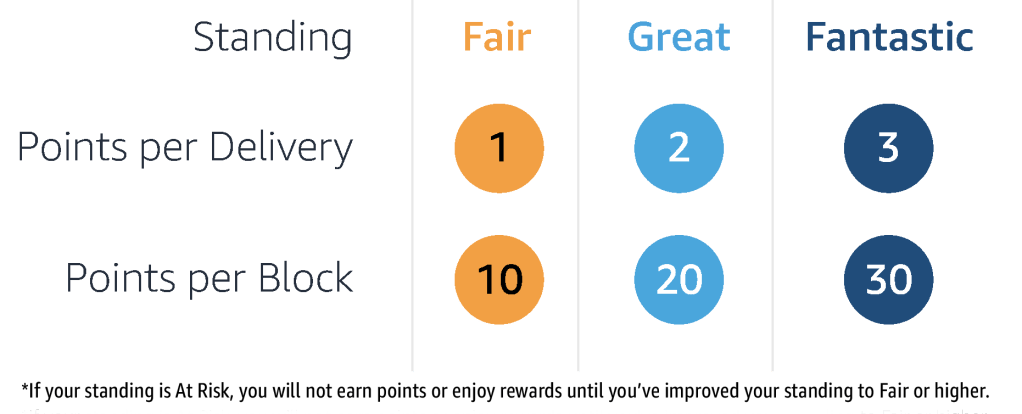 Amazon Flex, sürücü performansını puanla değerlendirir. Yaptığınız her teslimat ve blok karşılığında puan kazanırsınız. Ancak kazandığınız puan miktarı, hesabınızın “Standing” (performans durumu) seviyesine bağlıdır: