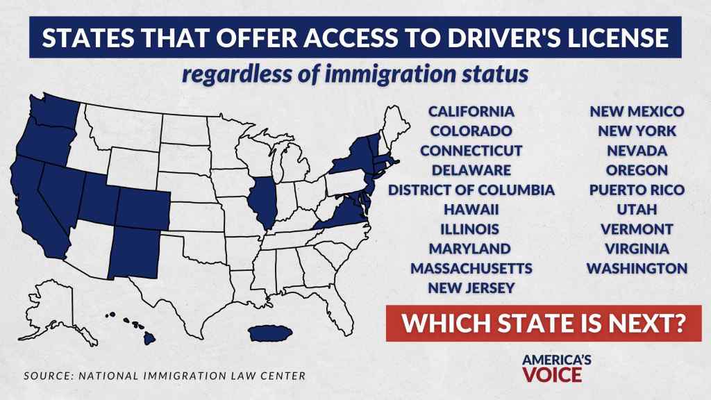 2024 yılı itibarıyla aşağıdaki eyaletler ve bölgeler, sürücü belgesi alabilmek için yasal göçmenlik statüsü ya da SSN şartı aramıyor. Bu eyaletlerde, belirli kimlik ve ikamet belgeleriyle başvuru yaparak ehliyet alınabiliyor: