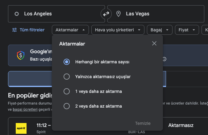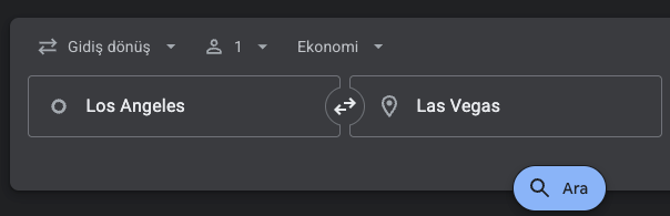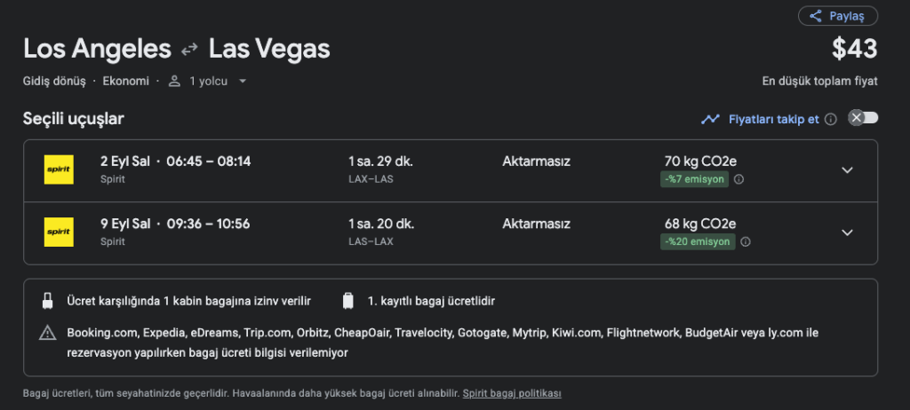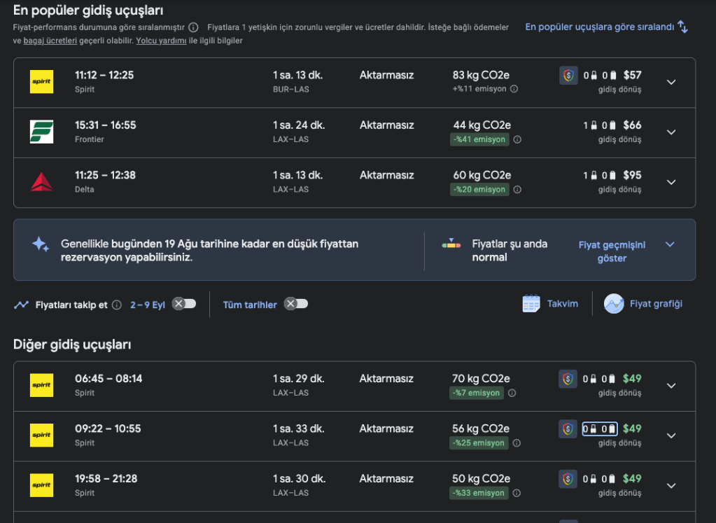 📍 Örnek olarak Los Angeles’tan Las Vegas’a uçuşları inceleyeceğiz.