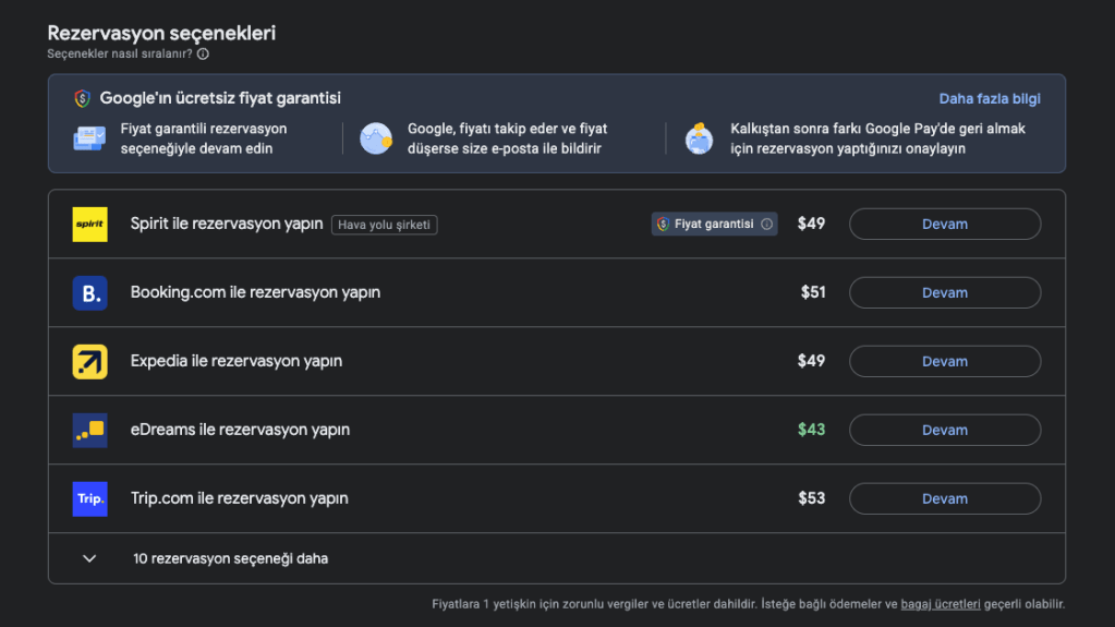💡 Bu bölümde, bileti farklı internet sitelerinden satın almanız halinde ödemeniz gereken fiyatlar listelenir. Örneğin, bu senaryoda en düşük fiyat 43 $ ile eDreams üzerinden görünüyor. Ancak ben bu yöntemi önermem. Çünkü zaten aynı havayolu şirketi ile uçacağımız için, bileti doğrudan havayolunun kendi internet sitesinden almak daha güvenlidir.